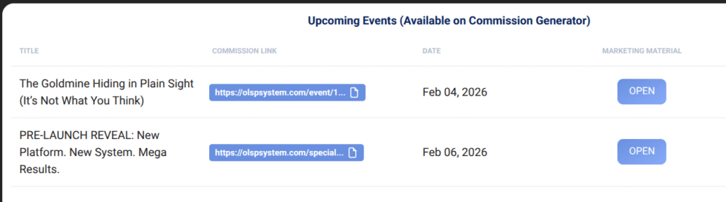 Log in to your OLSP back office. Then click the “Promote Live Events” tab at the top of the “Affiliate Center” page. Navigate to this panel and click the blue URL tab to copy your affiliate URL link to the “PRE-LAUNCH REVEAL” event on Feb 06, 2026: